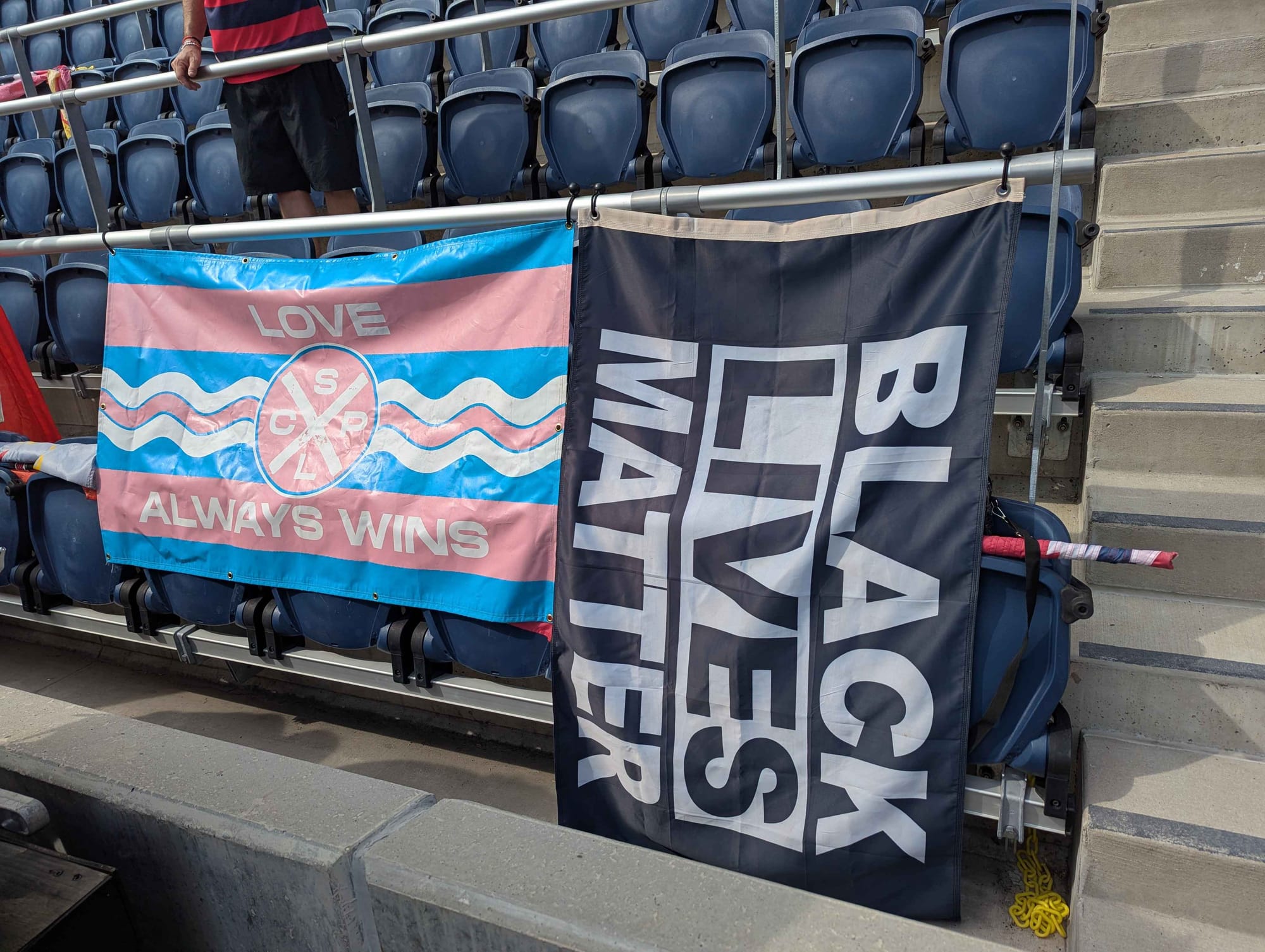 The items: one Trans-inclusivity sign reading “Love Always Wins” and a Black Lives Matter flag, which are typically affixed to a railing in the group’s section, were denied based on the club’s stricter enforcement of its own FCoC policies.