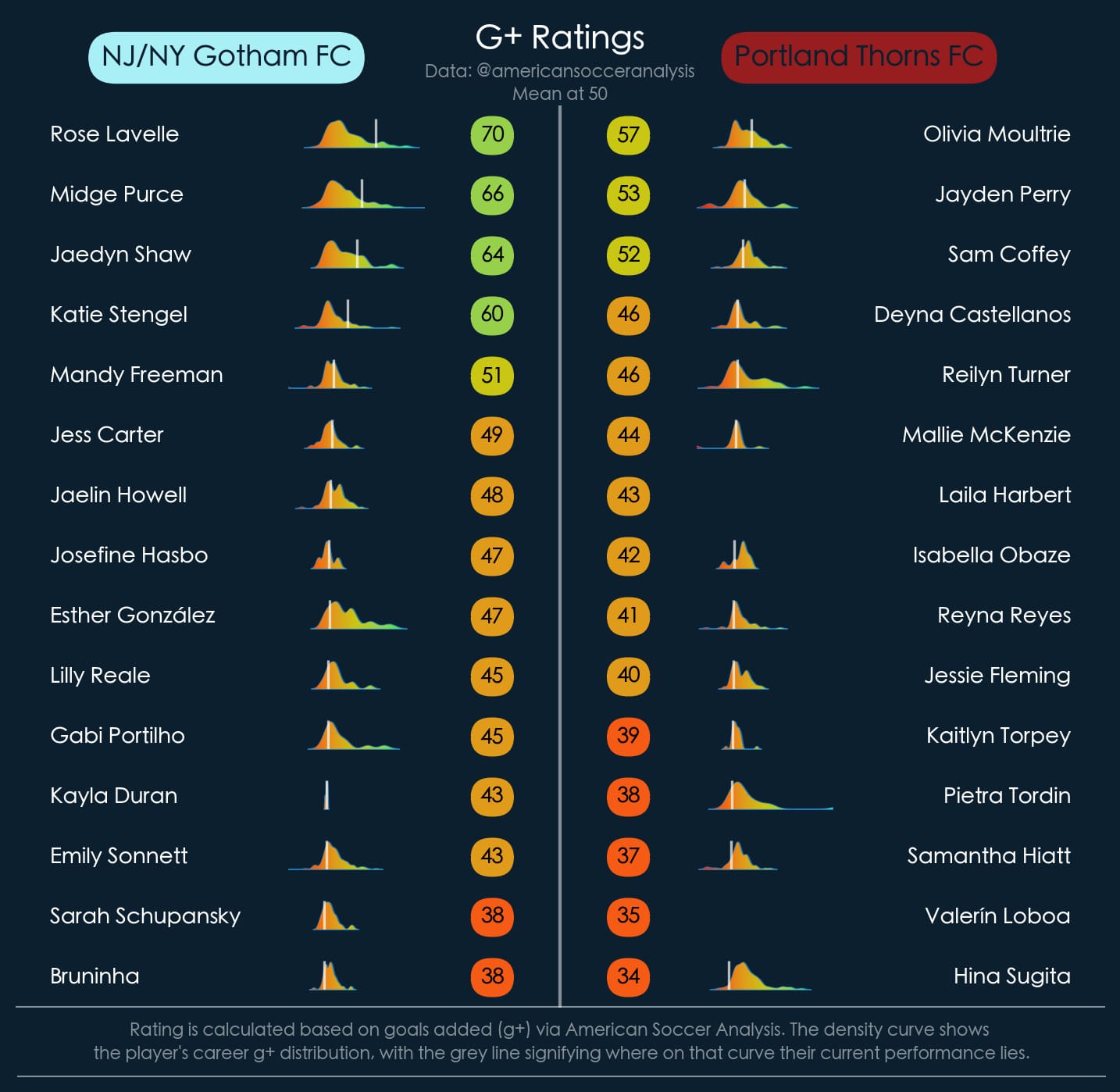 Lavelle now has 3 goals and 2 assists in her past 5 NWSL matches, finding her form just as Jaedyn Shaw comes aboard to share the creative load. Lavelle is one of the world’s best but is usually more of a creator than a goal scorer. Now, the freedom to play in a more advanced role, with Esther pulling defenders into her space and midfield partners that demand equal attention, it has resulted in her best scoring stretch since entering the league. There’s no reason to think she will slow down with 2.39 expected goals + assists in those 248 minutes, especially if Shaw and Midge Purse find their form over the club's final stretch.