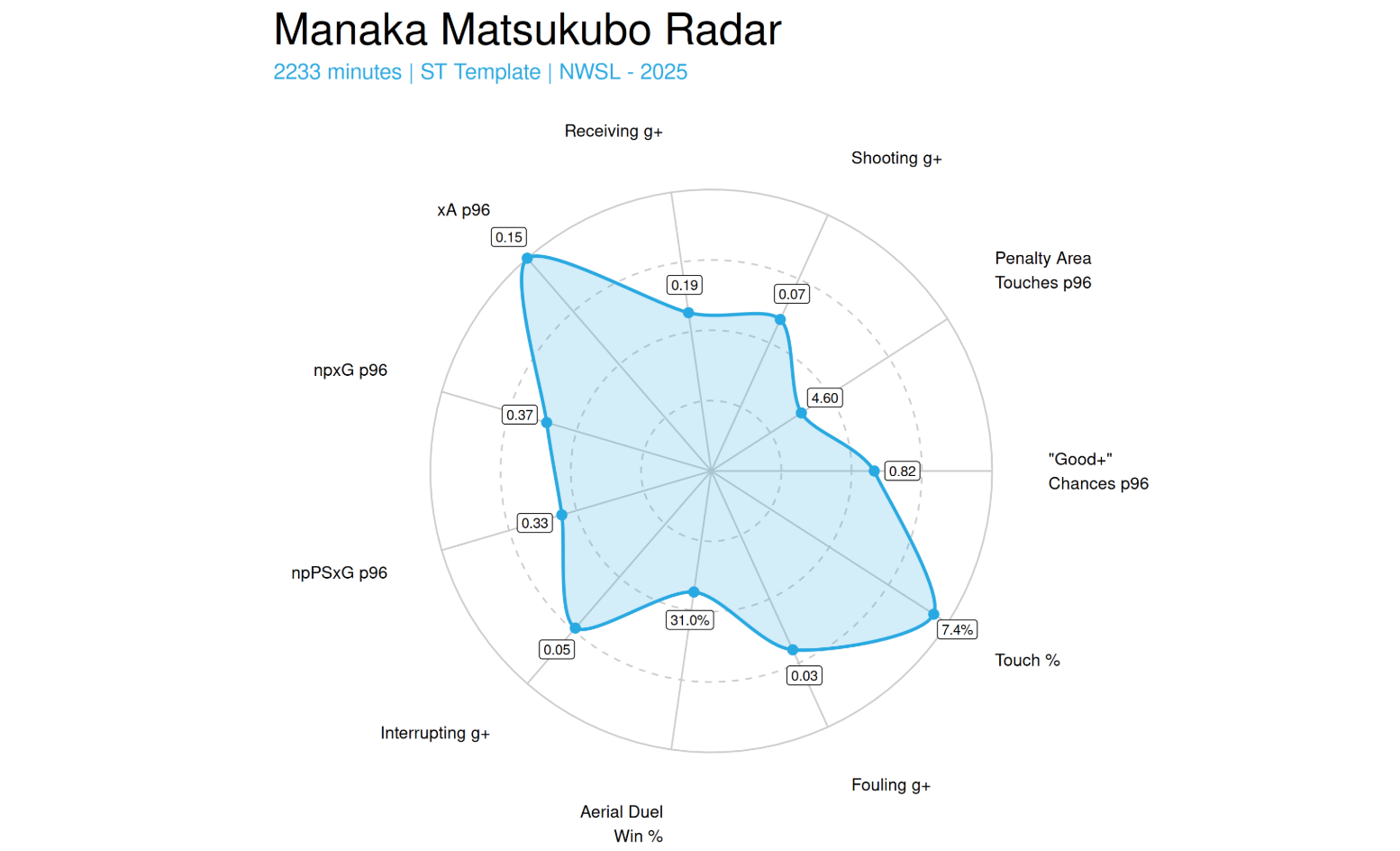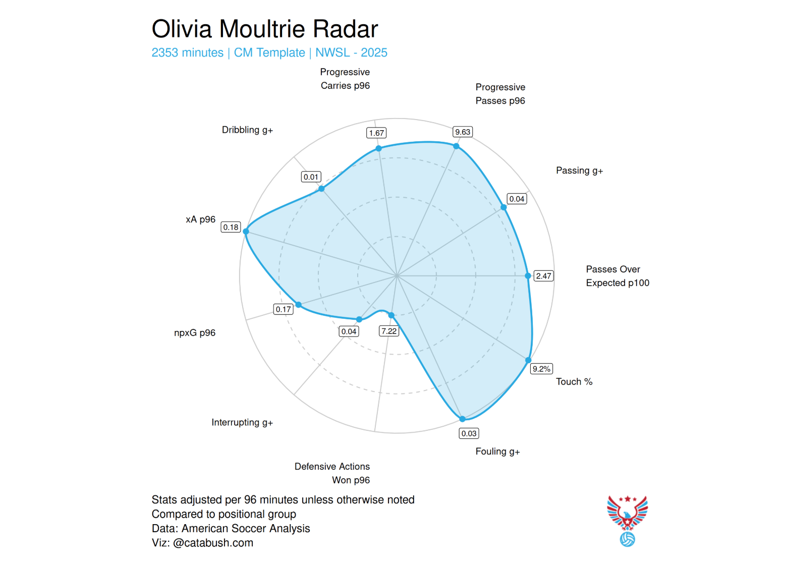 In 666 minutes, Ovalle already ranks 3rd in expected assists and leads Orlando with 0.24 xA per 96 minutes, along with 2.16 key passes and 0.48 xG + xA. Since her arrival, only Rose Lavelle, Olivia Moultrie, and Kenza Dali average more key passes per 96 minutes…. That’s a pretty good early sign.