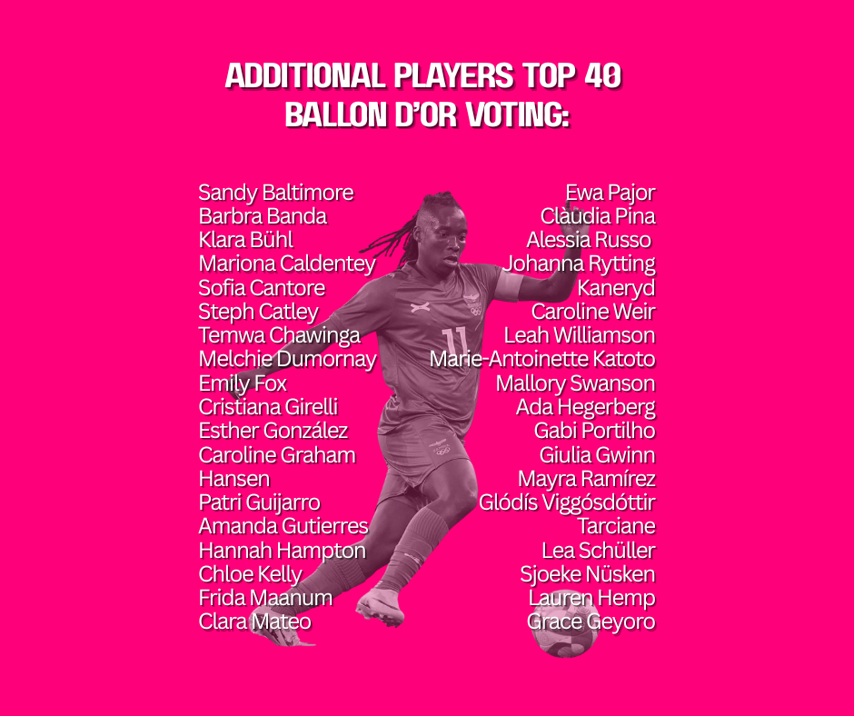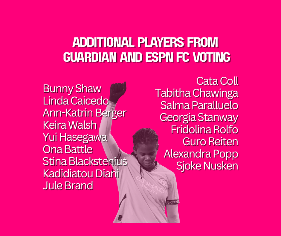 - The second problem is granting ESPNFC and The Guardian such an outsized role in deciding what players are eligible. Outlets – except mine, of course – are beholden to content that generates clicks, meaning that lists are created to generate conversation more than they are to be seen as a bible on the best players in the world. These outlets are Euro-centric and discount the NWSL’s accomplishments in the global market. The NWSL is at the very least a top-2 league in the world. Yet, Temwa Chawinga was the lone NWSL player in the Guardian’s top 10, only 6 players were represented in the top 40, while Trinity Rodman was the sole American NWSL player at #35 on the list.