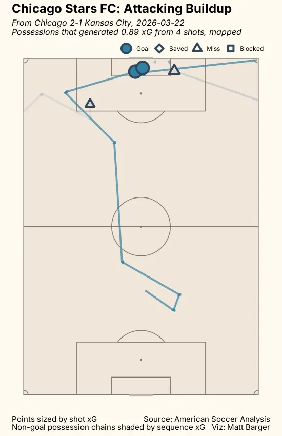 Moving into next week, where in the world is Elise Evans? Sjögren gets a reprieve from the agenda for a moment with Bea Franklin playing well in this one – 2 dribbles, 5 passes into the attacking 3rd, 6 interceptions, and 7 clearances – but that’s a player Chicago should want to see minutes through this compressed schedule.
