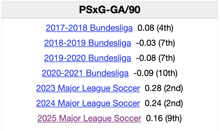 Unless Bürki maintains similar performances over the final three matches, this will still be another season where his shot-stopping numbers have regressed. Bürki prevented 9.1 post-shot expected goals during his MLS Goalkeeper of the Year campaign in 2023, dipped a bit to +7.6 in 2024, and has saved “just” +4.1 this season.