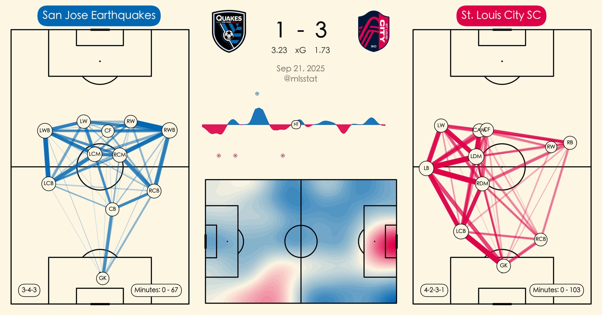 The first-half stats paint a picture of a squad that had control of open play, while outperforming their expected goals. It’s important to remember the game state heading into the second half. St. Louis wasn’t the more dangerous team, but they also pulled back on the accelerator, choosing their spots more carefully and attempting to clog the lanes as San Jose generated opportunities through Arango and Cristian Espinoza.