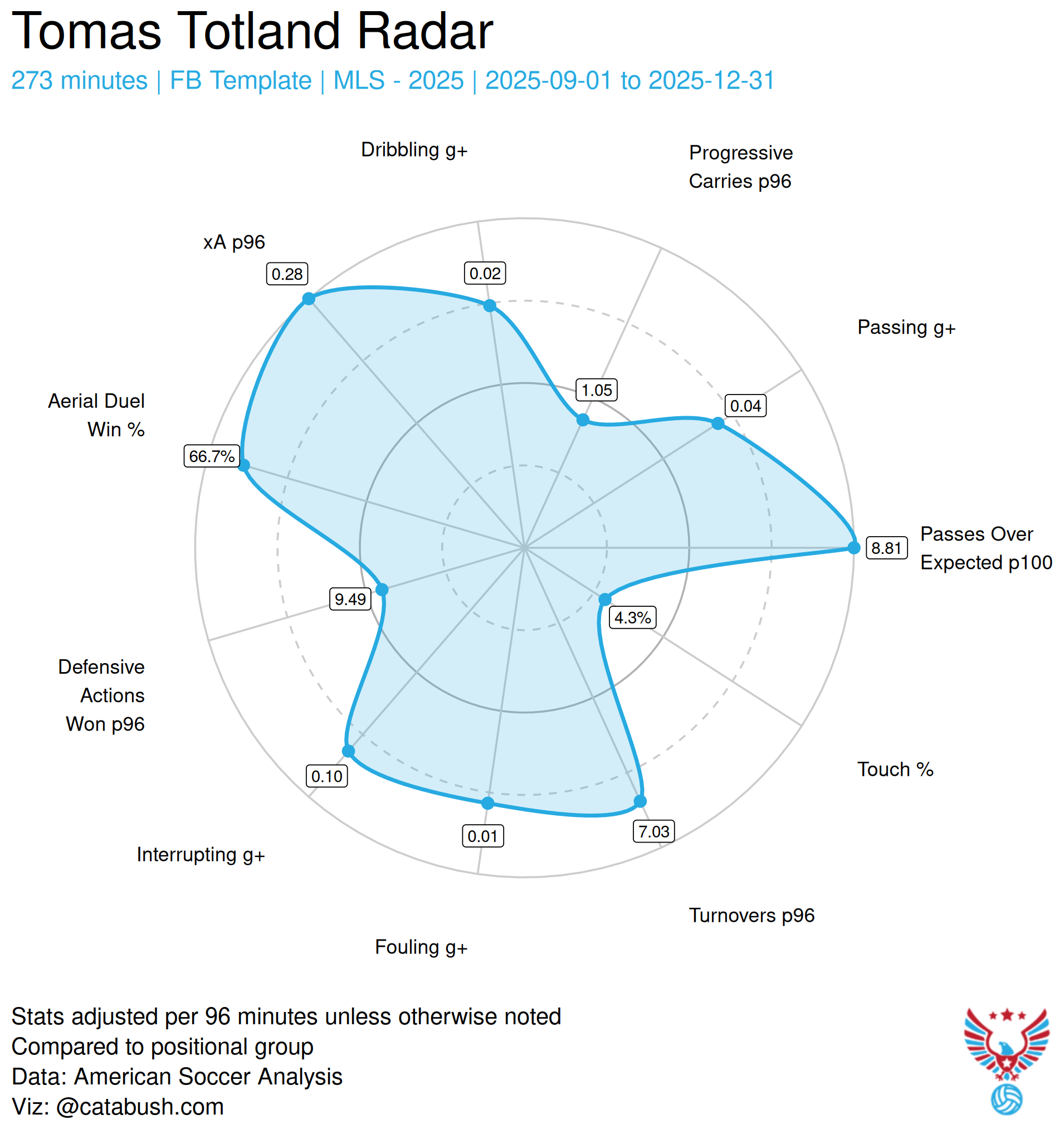 Heading into 2025, Totland should have been a focal point in Olof Mellberg’s more wingback-heavy system. It was a tenure that started well enough, and Totland was a large part of an early unbeaten run that saw CITY SC fail to concede through the first four matches of the season. However, a hamstring injury quickly derailed Totland’s progress, keeping him off the pitch for the entirety of a 11 match winless streak that finished in the sacking of Mellberg after just 15 MLS matches.
